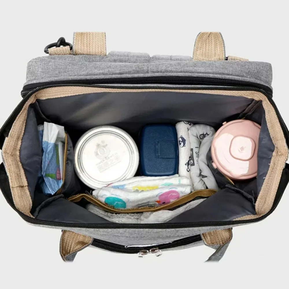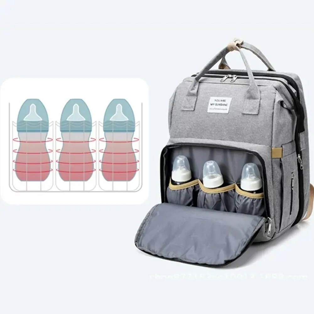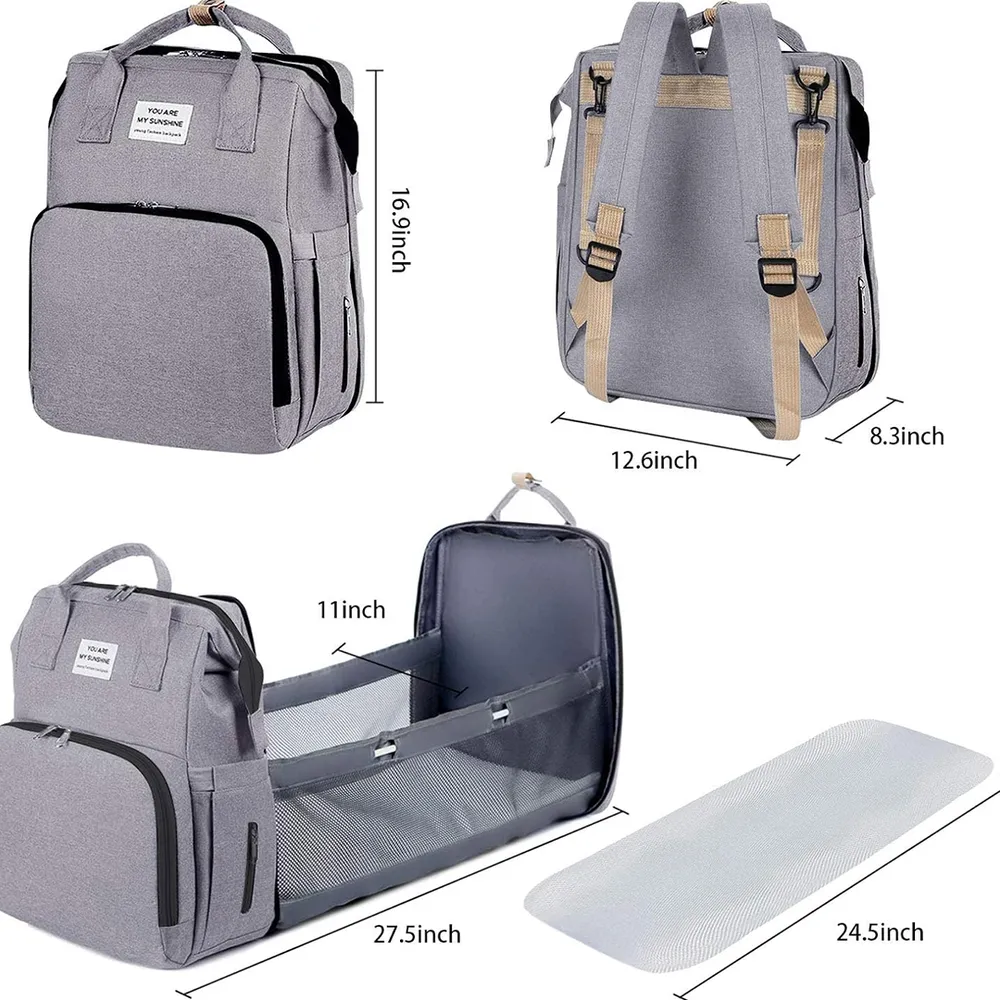 • تجمع حقيبة الحفاضات بين سرير سفر وحقيبة حفاضات وطاولة تغيير قابلة للحمل.