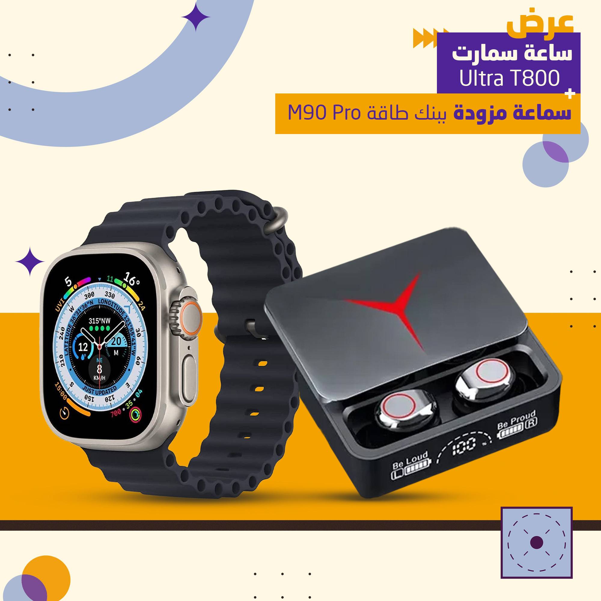 عرض حصري على الساعة الذكية Ultra T800 مع سماعة وباور بنك M90 pro