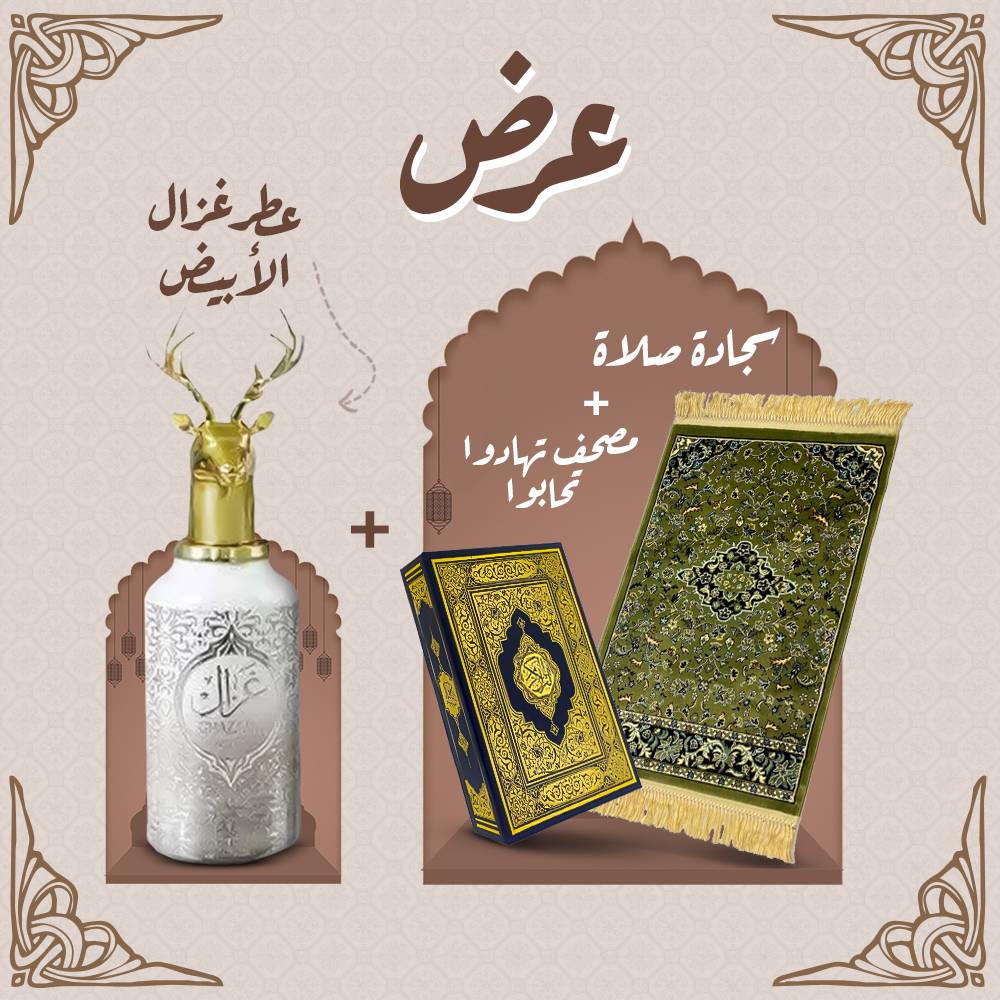 • جهز هدية مميزة لأحبائك. احصل على مجموعة رائعة تتضمن عطر غزال الأبيض، مصحف تهادوا تحابوا، وسجادة صلاة فاخرة. لا تفوت هذا العرض الرائع.